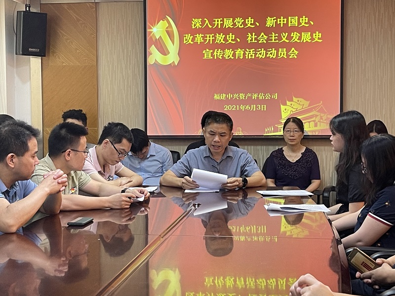 2021年6月3日,公司党支部全体党员和公司高管、部门经理、业务骨干、青年入党积极分子等参加了党支部组织的“深入开展党史、新中国史、改革开放史、社会主义发展史宣传教育活动动员会”。我们积极响应党中央的号召,将在全公司范围内深入开展学“四史”的宣传教育活动。学“四史”活动是进一步增强“四个意识”、坚定“四个自信”、做到“两个维护”,提高思想认识和政治站位的要求;也是我们努力做好本职工作,开拓未来,为资产评估行业进步、新福建建设、经济社会发展做出应有贡献的精神力量源泉。