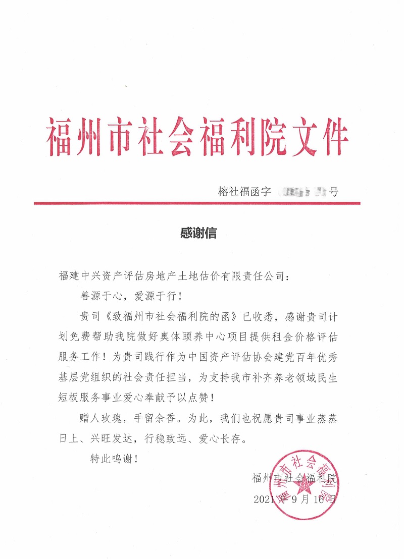 一、为社会福利机构提供免费的优质的专业资产评估服务2021年9月8日,公司党支部所属的党办协同资产评估业务运营管理部门和相关业务部门召开协调会,会议就福州市社会福利院邀请我司参与福利院管理的老年颐养中心房产租金评估项目应标一事达成一致意见:鉴于福州市社会福利院是扶老助弱的社会公益性质的非盈利机构,为践行用爱心和专业回报社会的理念,决定免费为其提供优质的专业资产评估服务。我们真诚的善心善行得到了福州市社会福利院等社会各界的高度肯定和赞扬!