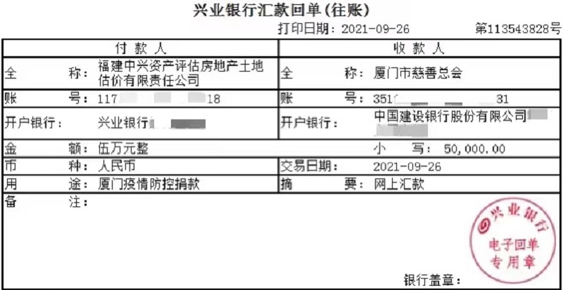为厦门疫情防控专项捐款人民币伍万元: