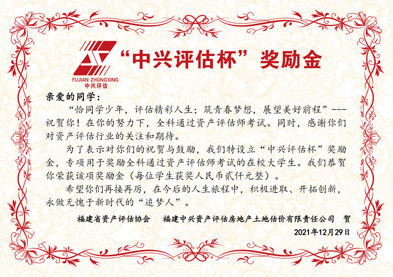 在本次活动中,福建省资产评估协会和中兴评估公司延续往年的教育公益行动,向全科通过资产评估师考试的在校大学生颁发“中兴评估杯”奖励金,奖励标准为2000元人民币/人。