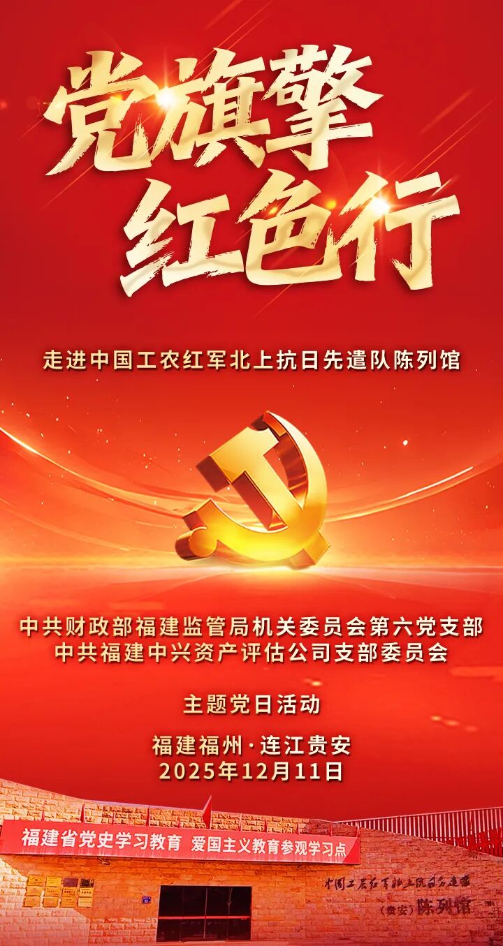 冬日暖阳和煦轻洒,鲜红党旗高高飘扬。2025年12月11日,中共财政部福建监管局机关委员会第六党支部全体党员在财政部福建监管局党组成员、纪检组长杨舜亭带领下,携手中共福建中兴资产评估公司支部委员会党员同志及青年入党积极分子,共同走进中国工农红军北上抗日先遣队(贵安)陈列馆,开展“党旗擎,红色行”主题党日活动。公司董事长李重阳参加活动。